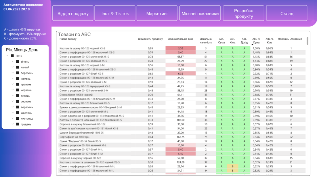 - Відсотковий розподіл категорій АВС в динаміці за місяці
